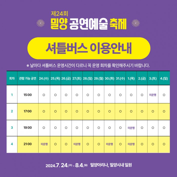 셔틀버스 이용 안내 페이지 정보 작성자 밀양공연예술축제 조회 4,667회 작성일 24-07-16 17:03 목록 본문 이전글제24회 밀양공연예술축제 제1회 밀양희곡상 당선작 안내 24.07.18 다음글제24회 밀양공연예술축제 '연극놀이'사전신청 24.07.10